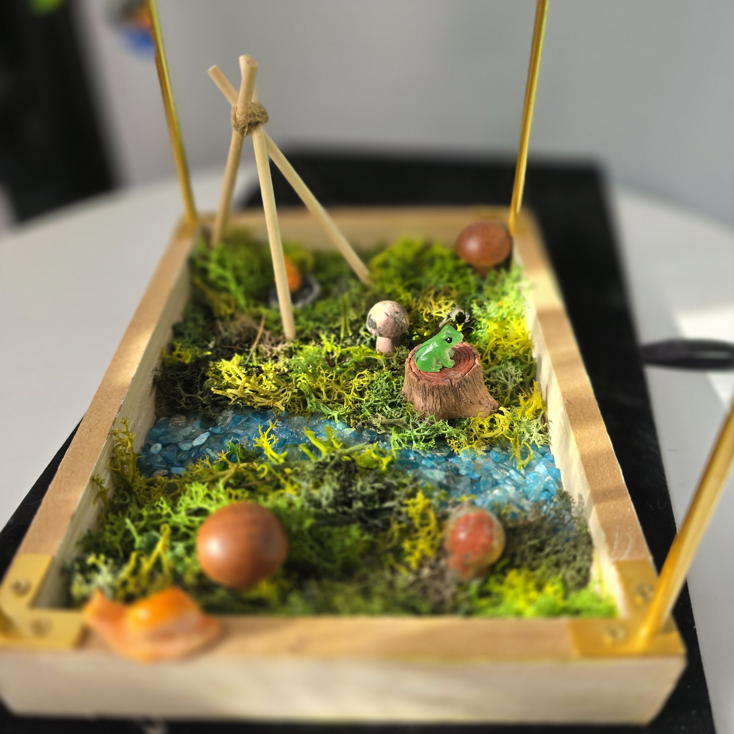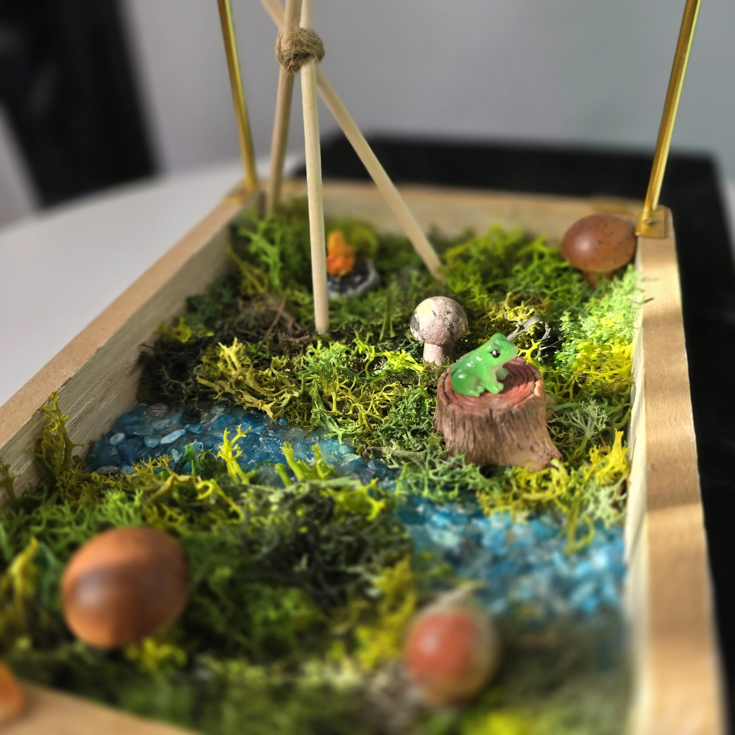 A tiny woodland moment, frozen in time. This miniature diorama captures a peaceful forest clearing where a clear blue stream winds through mossy ground, mushrooms sprout nearby, and a small frog rests atop a tree stump as if keeping watch.