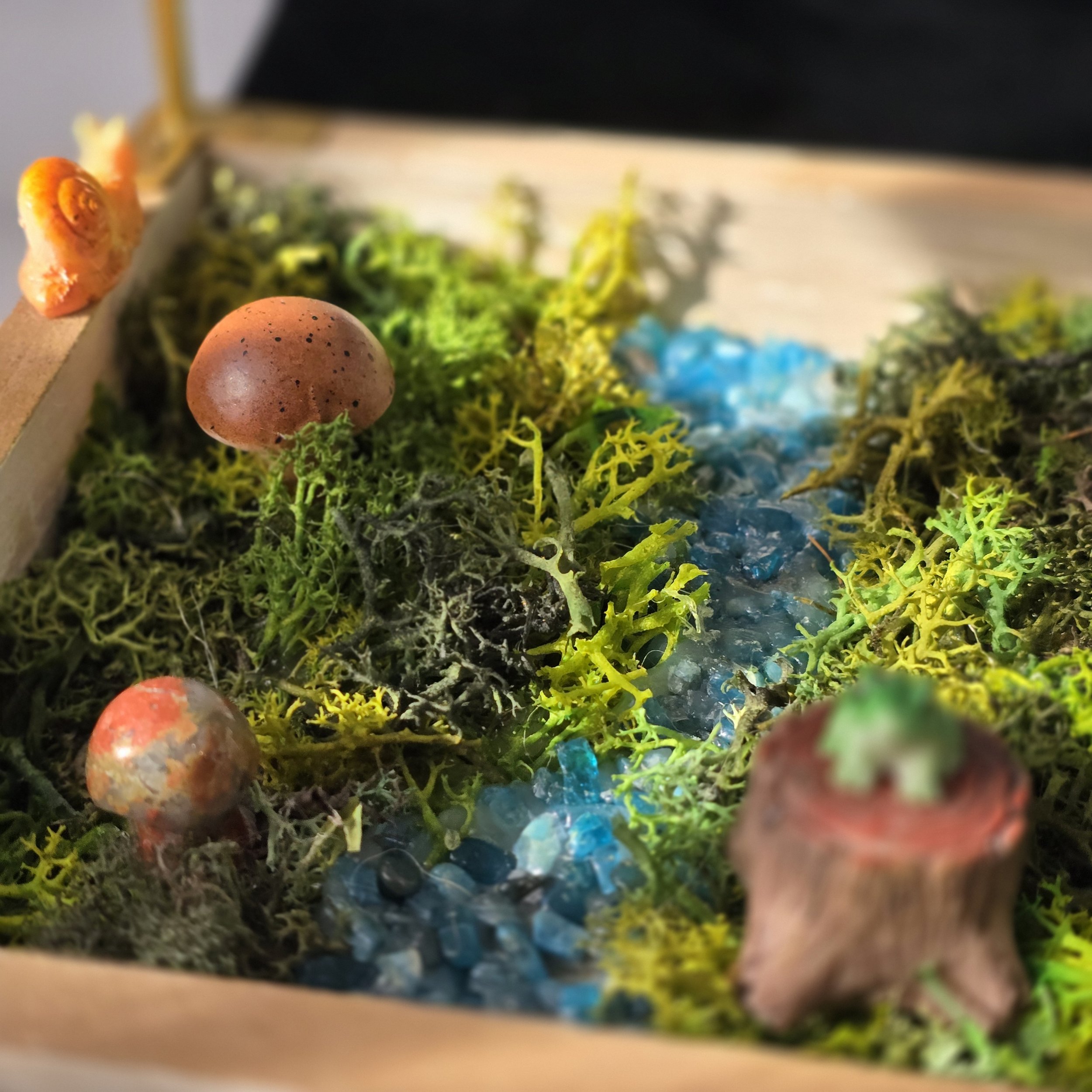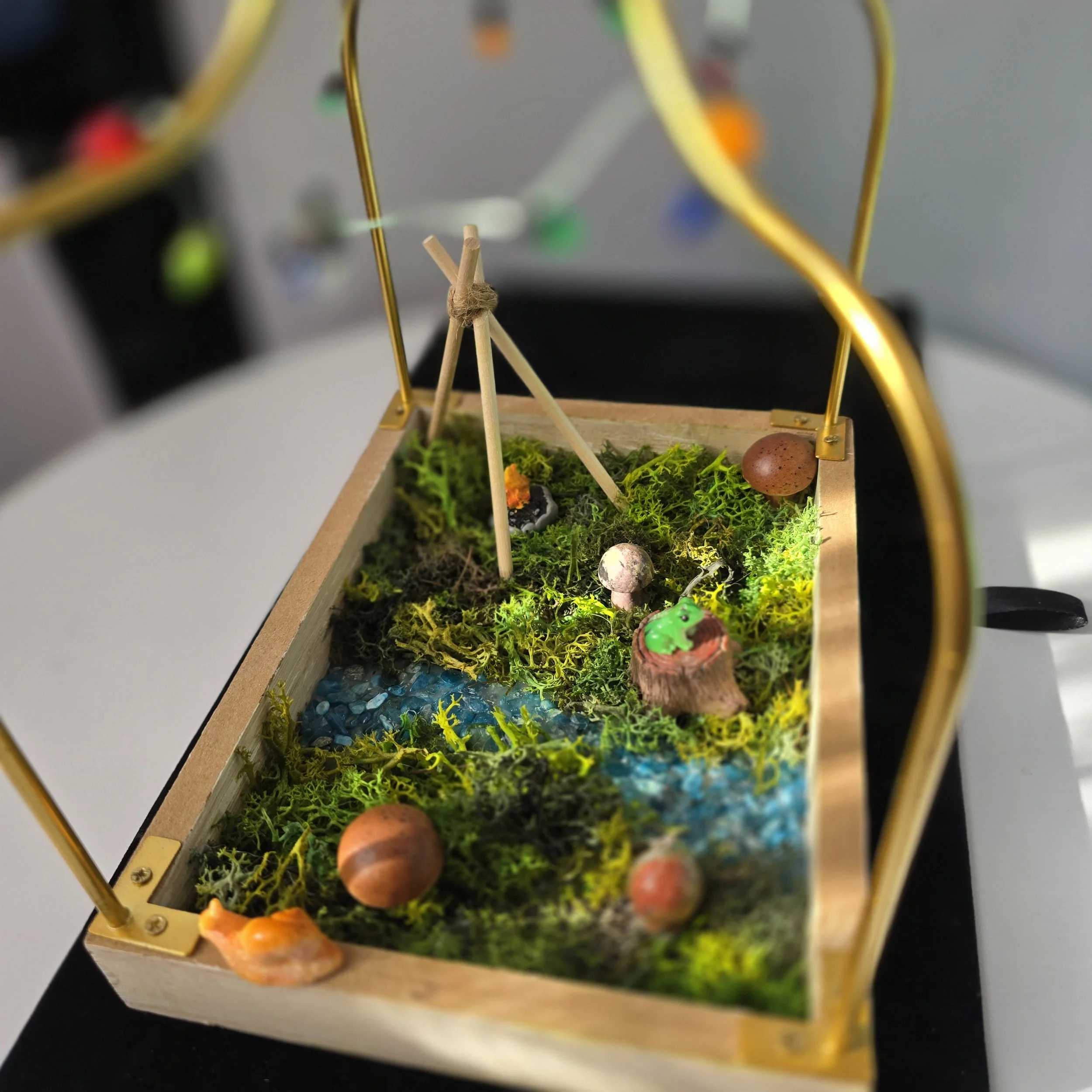 Hand-layered moss creates depth and texture, while polished blue stones form a gently flowing creek. Scattered throughout the scene are charming details: miniature mushrooms, a tiny campfire beneath a simple tripod, and a brass arch overhead strung with delicate lights and a shimmering crystal that catches the light just right.